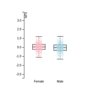 Blood protein levels in 96 healthy adults (aged 50–65) measured at six visits over a two-year period, shown separately for males and females. Relative protein abundances were quantified using the proximity extension assay (PEA) with the Olink Explore HT.