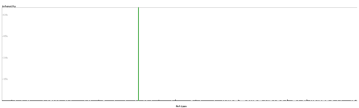 At the top of the view, the position of the antigen (identified by the corresponding HPA identifier) is shown as a green bar. A yellow triangle on the bar indicates a <100% sequence identity to the protein target.