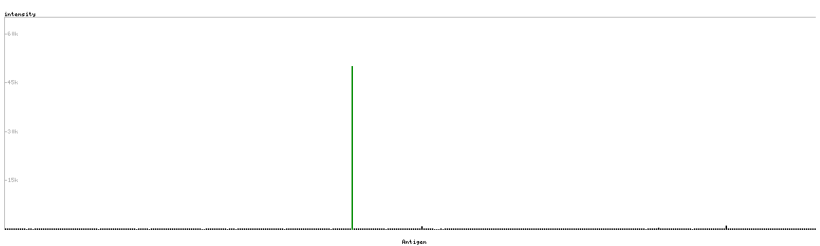 At the top of the view, the position of the antigen (identified by the corresponding HPA identifier) is shown as a green bar. A yellow triangle on the bar indicates a <100% sequence identity to the protein target.