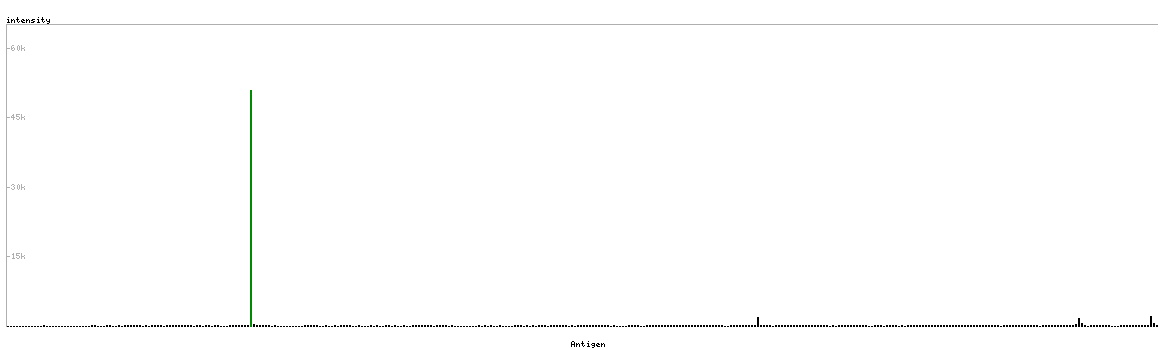 At the top of the view, the position of the antigen (identified by the corresponding HPA identifier) is shown as a green bar. A yellow triangle on the bar indicates a <100% sequence identity to the protein target.