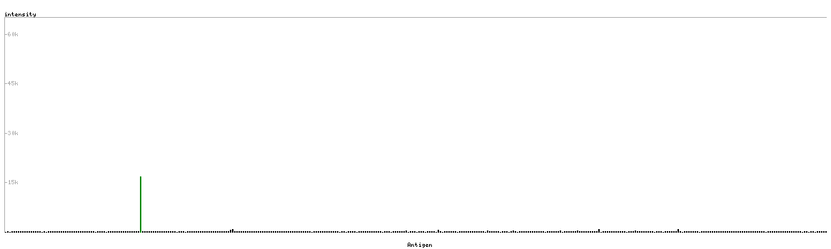 At the top of the view, the position of the antigen (identified by the corresponding HPA identifier) is shown as a green bar. A yellow triangle on the bar indicates a <100% sequence identity to the protein target.