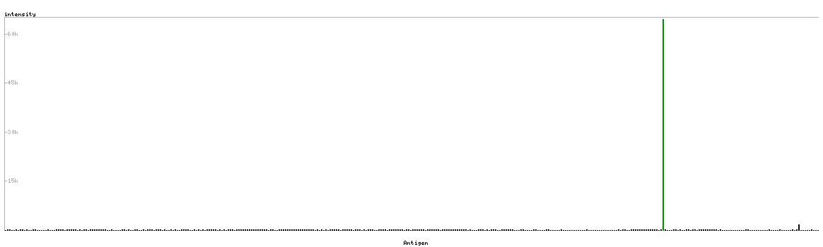 At the top of the view, the position of the antigen (identified by the corresponding HPA identifier) is shown as a green bar. A yellow triangle on the bar indicates a <100% sequence identity to the protein target.
