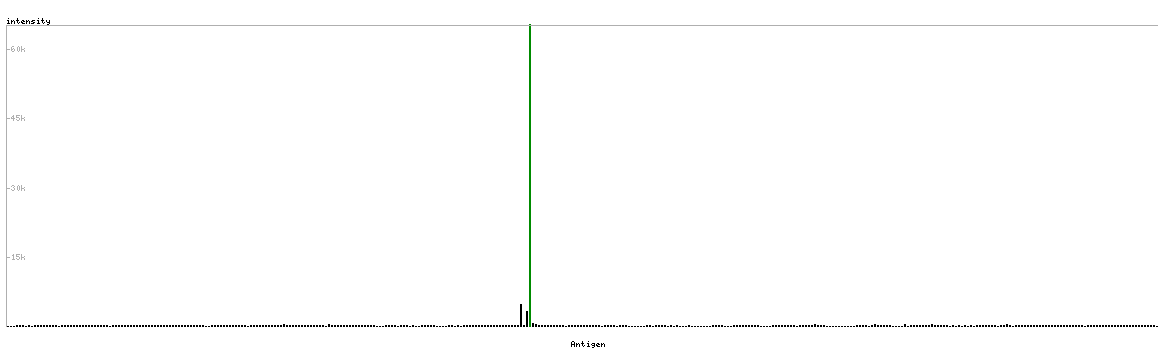 At the top of the view, the position of the antigen (identified by the corresponding HPA identifier) is shown as a green bar. A yellow triangle on the bar indicates a <100% sequence identity to the protein target.
