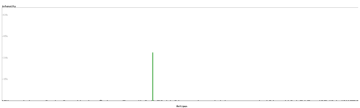 At the top of the view, the position of the antigen (identified by the corresponding HPA identifier) is shown as a green bar. A yellow triangle on the bar indicates a <100% sequence identity to the protein target.