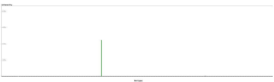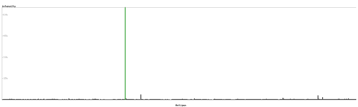 At the top of the view, the position of the antigen (identified by the corresponding HPA identifier) is shown as a green bar. A yellow triangle on the bar indicates a <100% sequence identity to the protein target.