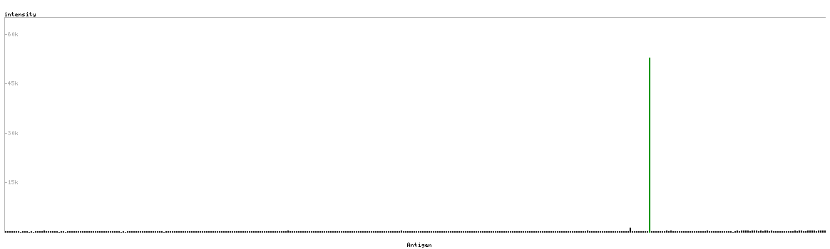 At the top of the view, the position of the antigen (identified by the corresponding HPA identifier) is shown as a green bar. A yellow triangle on the bar indicates a <100% sequence identity to the protein target.