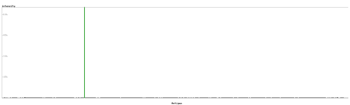 At the top of the view, the position of the antigen (identified by the corresponding HPA identifier) is shown as a green bar. A yellow triangle on the bar indicates a <100% sequence identity to the protein target.