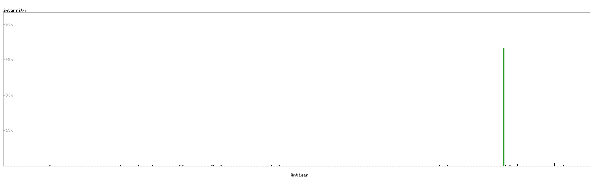 At the top of the view, the position of the antigen (identified by the corresponding HPA identifier) is shown as a green bar. A yellow triangle on the bar indicates a <100% sequence identity to the protein target.