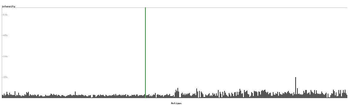 At the top of the view, the position of the antigen (identified by the corresponding HPA identifier) is shown as a green bar. A yellow triangle on the bar indicates a <100% sequence identity to the protein target.