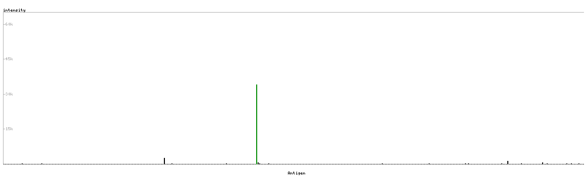 At the top of the view, the position of the antigen (identified by the corresponding HPA identifier) is shown as a green bar. A yellow triangle on the bar indicates a <100% sequence identity to the protein target.