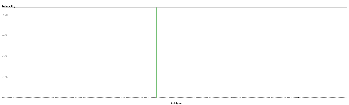 At the top of the view, the position of the antigen (identified by the corresponding HPA identifier) is shown as a green bar. A yellow triangle on the bar indicates a <100% sequence identity to the protein target.