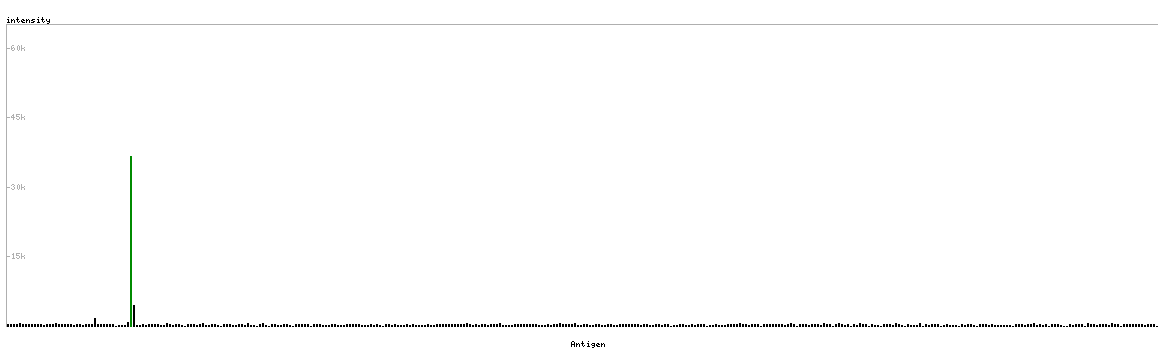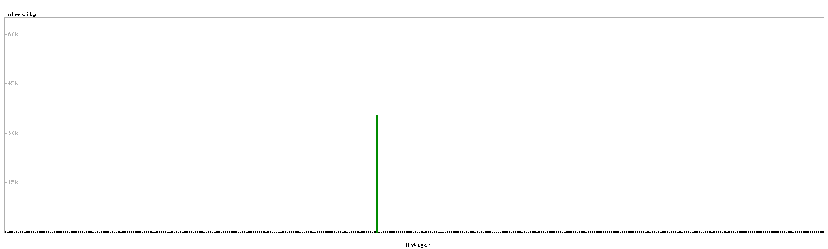 At the top of the view, the position of the antigen (identified by the corresponding HPA identifier) is shown as a green bar. A yellow triangle on the bar indicates a <100% sequence identity to the protein target.
