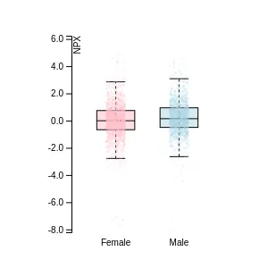 Blood protein levels in 96 healthy adults (aged 50–65) measured at six visits over a two-year period, shown separately for males and females. Relative protein abundances were quantified using the proximity extension assay (PEA) with the Olink Explore HT.