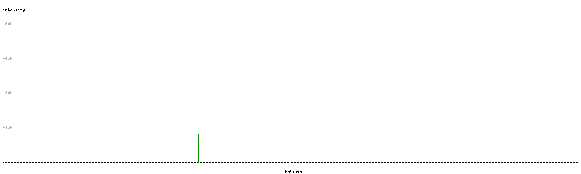 At the top of the view, the position of the antigen (identified by the corresponding HPA identifier) is shown as a green bar. A yellow triangle on the bar indicates a <100% sequence identity to the protein target.