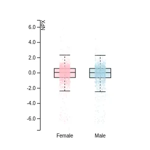 Blood protein levels in 96 healthy adults (aged 50–65) measured at six visits over a two-year period, shown separately for males and females. Relative protein abundances were quantified using the proximity extension assay (PEA) with the Olink Explore HT.