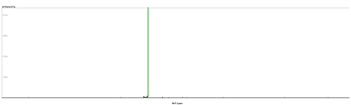 At the top of the view, the position of the antigen (identified by the corresponding HPA identifier) is shown as a green bar. A yellow triangle on the bar indicates a <100% sequence identity to the protein target.