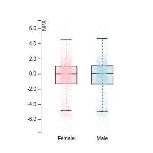 Blood protein levels in 96 healthy adults (aged 50–65) measured at six visits over a two-year period, shown separately for males and females. Relative protein abundances were quantified using the proximity extension assay (PEA) with the Olink Explore HT.