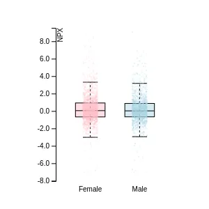 Blood protein levels in 96 healthy adults (aged 50–65) measured at six visits over a two-year period, shown separately for males and females. Relative protein abundances were quantified using the proximity extension assay (PEA) with the Olink Explore HT.