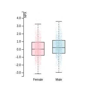 Blood protein levels in 96 healthy adults (aged 50–65) measured at six visits over a two-year period, shown separately for males and females. Relative protein abundances were quantified using the proximity extension assay (PEA) with the Olink Explore HT.