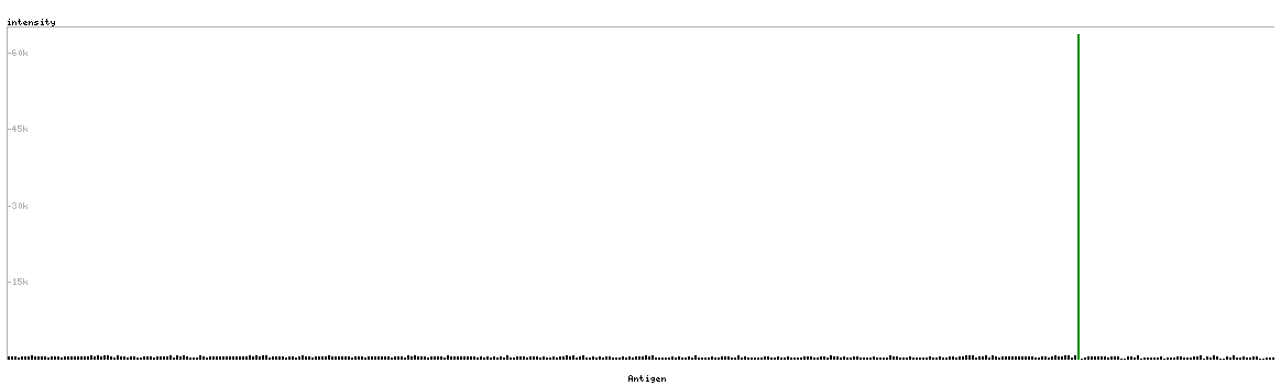 At the top of the view, the position of the antigen (identified by the corresponding HPA identifier) is shown as a green bar. A yellow triangle on the bar indicates a <100% sequence identity to the protein target.