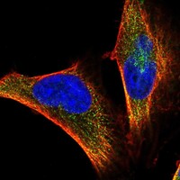Assay for determining the subcellular location of the encoded protein(s) in human cell lines by indirect immunofluorescence and confocal microscopy. The antibody-based staining is generally carried out in U2OS and up to two additional cell lines, selected based on RNA expression. Representative multi-color images showing the protein of interest in green are displayed below. The images also include markers for the nucleus (blue), microtubules (red) and ER (yellow). All images are clickable for an enlarged view. For an overview of cellular compartments, visit the cell structure dictionary.