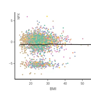 Blood protein levels by age, BMI, and sex, measured using the proximity extension assay (PEA) with the Olink Explore 1536. In the age and sex scatterplots, samples are colored by disease class.