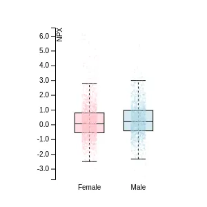 Blood protein levels in 96 healthy adults (aged 50–65) measured at six visits over a two-year period, shown separately for males and females. Relative protein abundances were quantified using the proximity extension assay (PEA) with the Olink Explore HT.