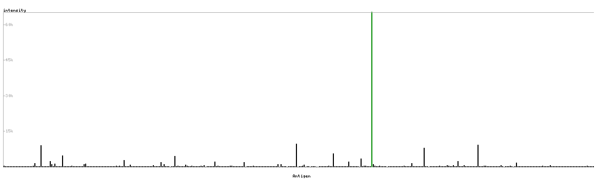 At the top of the view, the position of the antigen (identified by the corresponding HPA identifier) is shown as a green bar. A yellow triangle on the bar indicates a <100% sequence identity to the protein target.
