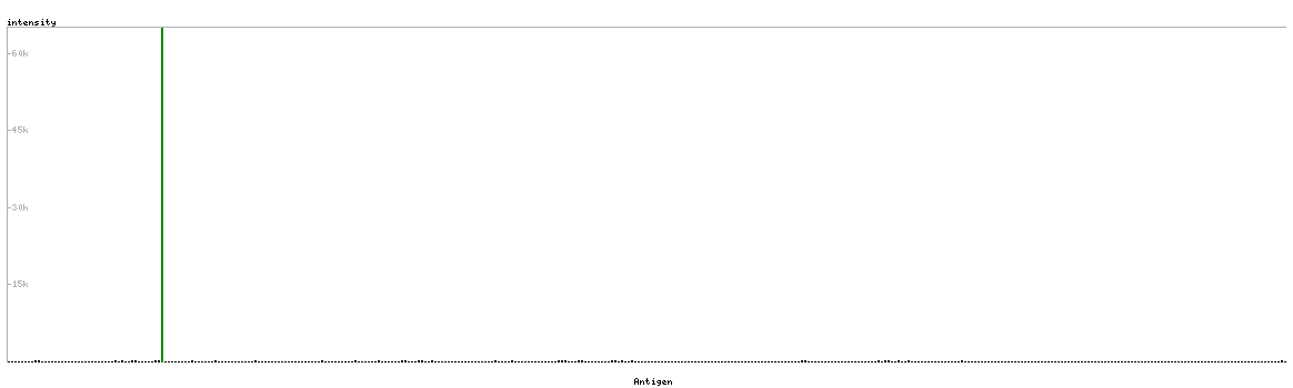 At the top of the view, the position of the antigen (identified by the corresponding HPA identifier) is shown as a green bar. A yellow triangle on the bar indicates a <100% sequence identity to the protein target.