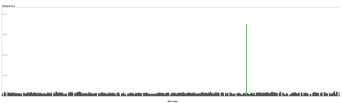 At the top of the view, the position of the antigen (identified by the corresponding HPA identifier) is shown as a green bar. A yellow triangle on the bar indicates a <100% sequence identity to the protein target.