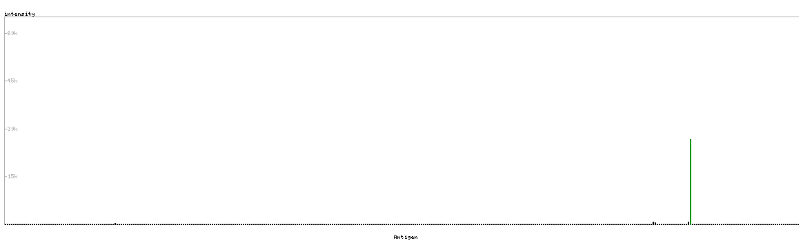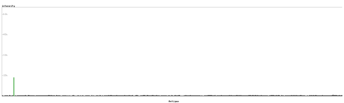 At the top of the view, the position of the antigen (identified by the corresponding HPA identifier) is shown as a green bar. A yellow triangle on the bar indicates a <100% sequence identity to the protein target.