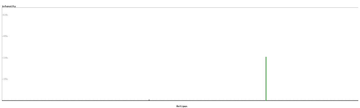 At the top of the view, the position of the antigen (identified by the corresponding HPA identifier) is shown as a green bar. A yellow triangle on the bar indicates a <100% sequence identity to the protein target.