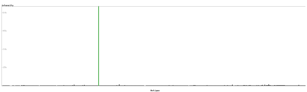 At the top of the view, the position of the antigen (identified by the corresponding HPA identifier) is shown as a green bar. A yellow triangle on the bar indicates a <100% sequence identity to the protein target.