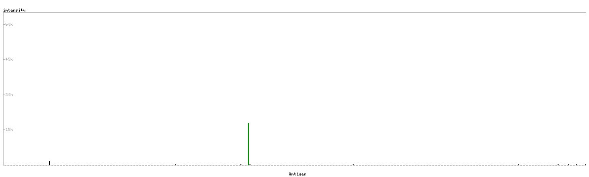At the top of the view, the position of the antigen (identified by the corresponding HPA identifier) is shown as a green bar. A yellow triangle on the bar indicates a <100% sequence identity to the protein target.