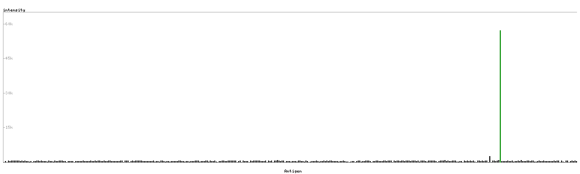 At the top of the view, the position of the antigen (identified by the corresponding HPA identifier) is shown as a green bar. A yellow triangle on the bar indicates a <100% sequence identity to the protein target.