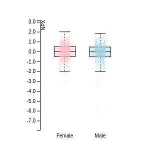 Blood protein levels in 96 healthy adults (aged 50–65) measured at six visits over a two-year period, shown separately for males and females. Relative protein abundances were quantified using the proximity extension assay (PEA) with the Olink Explore HT.