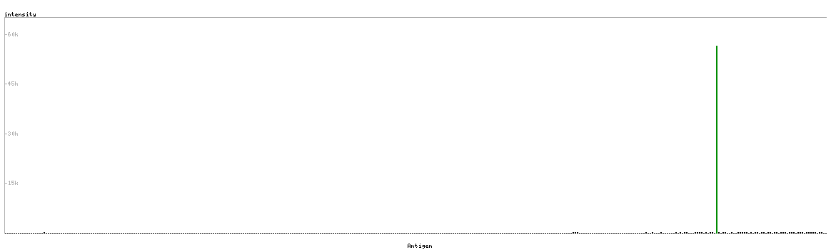At the top of the view, the position of the antigen (identified by the corresponding HPA identifier) is shown as a green bar. A yellow triangle on the bar indicates a <100% sequence identity to the protein target.