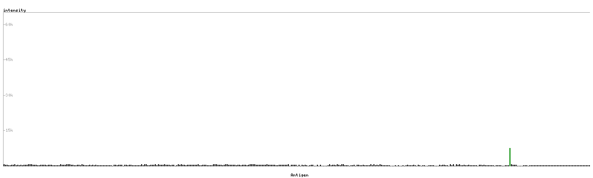 At the top of the view, the position of the antigen (identified by the corresponding HPA identifier) is shown as a green bar. A yellow triangle on the bar indicates a <100% sequence identity to the protein target.