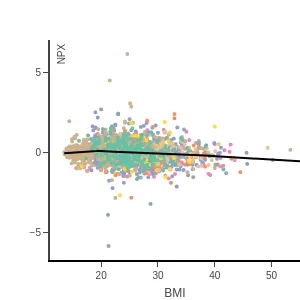 Blood protein levels by age, BMI, and sex, measured using the proximity extension assay (PEA) with the Olink Explore 1536. In the age and sex scatterplots, samples are colored by disease class.