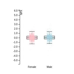 Blood protein levels in 96 healthy adults (aged 50–65) measured at six visits over a two-year period, shown separately for males and females. Relative protein abundances were quantified using the proximity extension assay (PEA) with the Olink Explore HT.