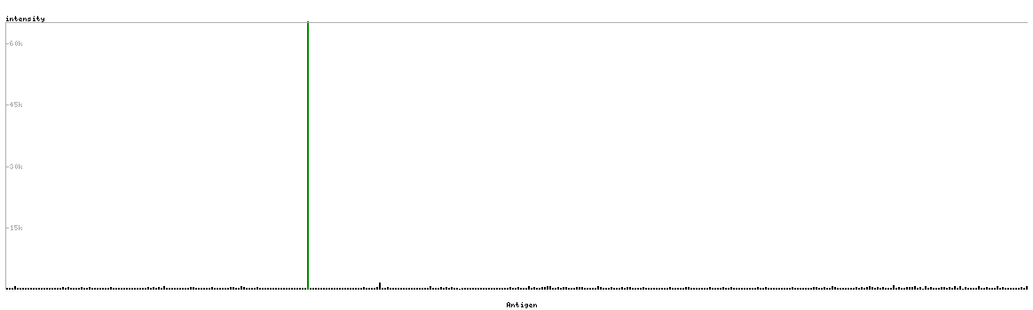 At the top of the view, the position of the antigen (identified by the corresponding HPA identifier) is shown as a green bar. A yellow triangle on the bar indicates a <100% sequence identity to the protein target.