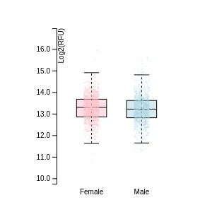 Blood protein levels in 96 healthy adults (aged 50–65) measured at six visits over a two-year period, shown separately for males and females. Relative protein abundances were quantified using the proximity extension assay (PEA) with the Olink Explore HT.