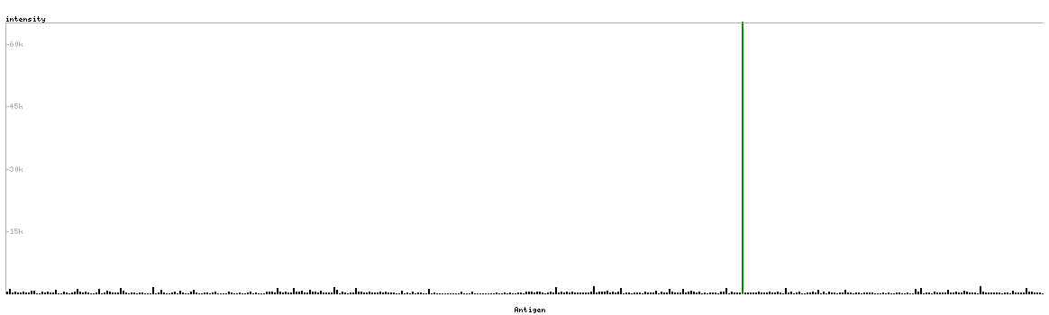 At the top of the view, the position of the antigen (identified by the corresponding HPA identifier) is shown as a green bar. A yellow triangle on the bar indicates a <100% sequence identity to the protein target.