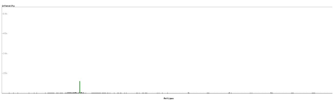 At the top of the view, the position of the antigen (identified by the corresponding HPA identifier) is shown as a green bar. A yellow triangle on the bar indicates a <100% sequence identity to the protein target.