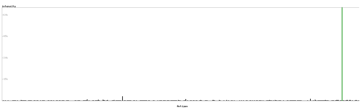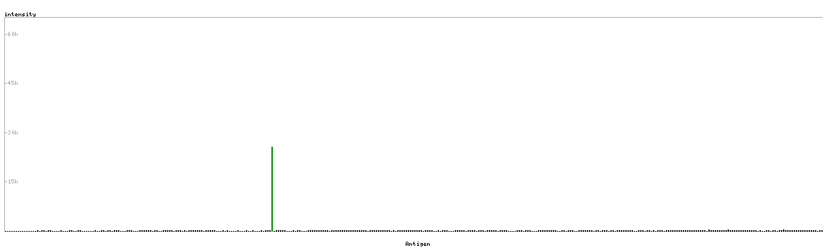 At the top of the view, the position of the antigen (identified by the corresponding HPA identifier) is shown as a green bar. A yellow triangle on the bar indicates a <100% sequence identity to the protein target.