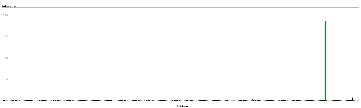 At the top of the view, the position of the antigen (identified by the corresponding HPA identifier) is shown as a green bar. A yellow triangle on the bar indicates a <100% sequence identity to the protein target.