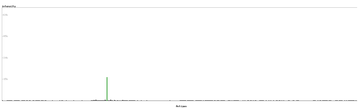 At the top of the view, the position of the antigen (identified by the corresponding HPA identifier) is shown as a green bar. A yellow triangle on the bar indicates a <100% sequence identity to the protein target.
