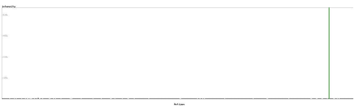 At the top of the view, the position of the antigen (identified by the corresponding HPA identifier) is shown as a green bar. A yellow triangle on the bar indicates a <100% sequence identity to the protein target.