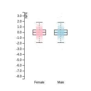 Blood protein levels in 96 healthy adults (aged 50–65) measured at six visits over a two-year period, shown separately for males and females. Relative protein abundances were quantified using the proximity extension assay (PEA) with the Olink Explore HT.