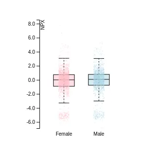 Blood protein levels in 96 healthy adults (aged 50–65) measured at six visits over a two-year period, shown separately for males and females. Relative protein abundances were quantified using the proximity extension assay (PEA) with the Olink Explore HT.